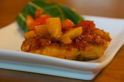 Assuming the fish is done to your desired taste, take the filets out with most of the juices, the onions and the tomatoes and put in a serving dish. Now, add the mango to the pan and let it soften for about 3 minutes or so. Then, turn the heat up on the pan to medium high and add the maple syrup. Work quickly to caramelize the syrup into the mango and then pour on top of the filets. Make sure you get every bit of mango and all the syrup.