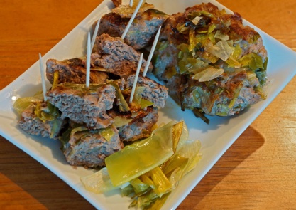 Once the leeks are soft, cut them rustically into pieces that are about 1 to 2 inches. Then simply mix with all of the other ingredients except the oil. Then form the mixture into flat round patties about 3 inches in diameter. Make sure you indent the center with your thumb so that they don’t plump up too much when you cook them.